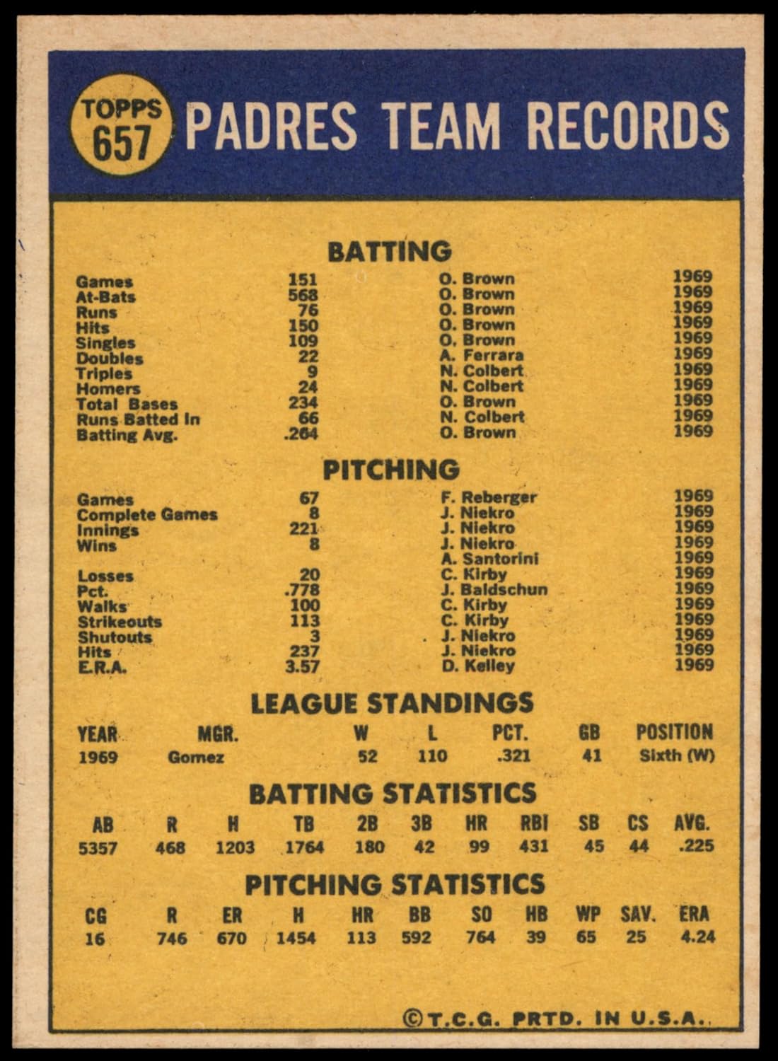 1970 Topps #657 Padres Team San Diego Padres (Baseball Card) EX Padres. Dean's Cards was founded in 2001 by Dean Hanley, a fellow card collector, and has become the leading online seller of vintage sports cards and non-sports cards. Our inventory has grown to more than a million vintage cards and we have a staff of 14 employees and a 5000 sq. ft. office space in Cincinnati, Ohio to offer you quick and personal service. Dean also has written two books on collecting vintage baseball cards. If you will give us the opportunity to earn your business, you will be glad that you did. We guarantee it!SN: ST01 06 8346