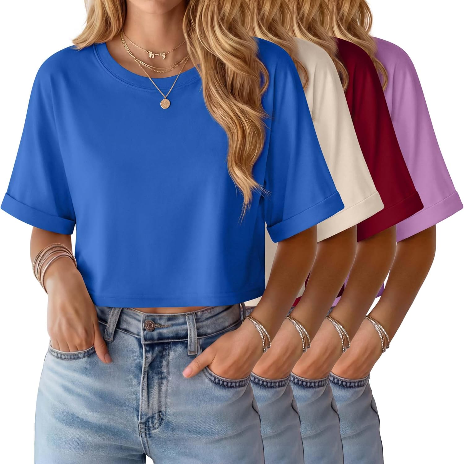 Features: Loose crop tops for women is designed for women's casual daily lifestyle, and combines comfort with relaxed style, suitable for daily wear, casual outings, commuting, light home office, park strolls or street walks etc Our cute shirts for women are available in multiple sizes, please measure your shoulder and bust according to our size chart and choose the right size of your tees Material: 90% Cotton, 10% Spandex Package includes: 4 X Cropped T Shirts for Women Notes: Manual measurement, please allow slight errors on size. The color may exist a slight difference due to different screen displays