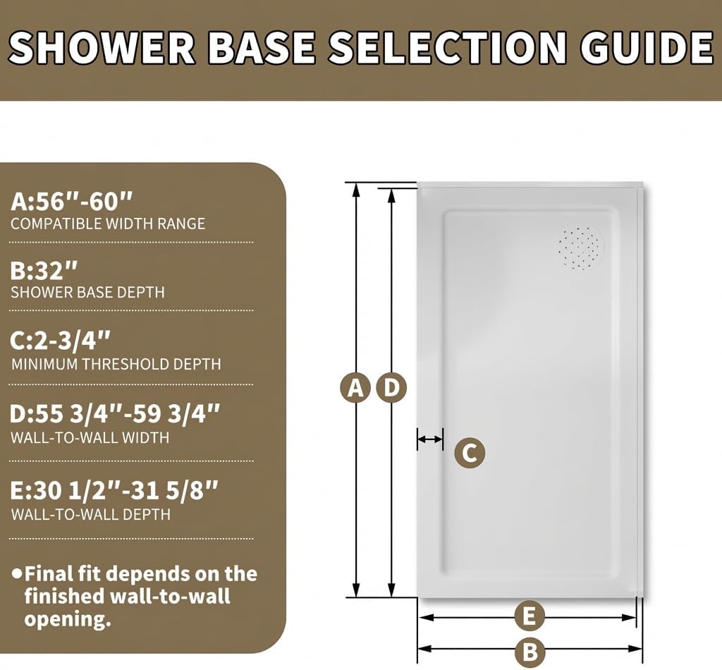 Basic Product InformationMaterial:- 5/16" (8mm) thick tempered safety glass (ANSI Z97.1 certified) - Brushed nickel stainless steel frame (SGCC certified) Design Features:- Smooth-sliding dual roller system - Frameless minimalist style - Adjustable width (56" to 60") by cutting top rail - Adjustable return panel width (30 1/2" to 31 5/8") - Tolerates up to 1/4" (6mm) wall unevenness Installation Requirements:- Minimum 3-1/8" threshold width - Must be mounted to wall studs - Includes all hardware and sealing gaskets - Professional installation recommended Dimensions & Compatibility:- 72" tall opening Warranty:- 1-year limited warranty