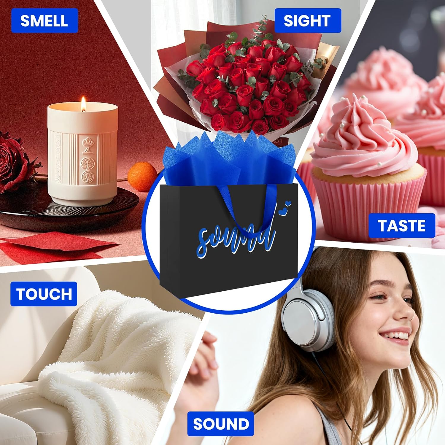 Awaken the five senses with a single gift; preserve the emotion with an experience. Our Five Senses Gift Bag Set is more than just packaging—it's a thoughtfully designed journey of emotion. Through visual, olfactory, tactile, gustatory, and auditory experiences, it helps you craft a unique gift brimming with heartfelt intention and surprise. This set includes five premium gift bags, each printed with a sensory theme word: SIGHT , SMELL, TOUCH, TASTE, SOUND. Combined with sensory guidance, it helps you curate truly heartfelt gifts for loved ones, family, or friends—whether scented candles, handmade chocolates, silk scarves, music playlists, or exquisite jewelry, each gift gains deeper meaning through this thoughtful design. The set also includes a full complement of celebration decorations: 10 sheets of premium tissue paper, an “I Love You” inflatable banner, 1 triangle banner, 12 balloons, a greeting card, and 1000 rose petals. Easily transform any space into a romantic party scene, creating a sense of ceremony and photo-worthy ambiance where every moment is worth capturing. Whether it's a birthday, anniversary, Valentine's Day, wedding, or any special occasion to express “I love you,” this sensory gift bag set elevates a simple gift into an immersive surprise experience—because truly moving gifts aren't just seen, they're felt.