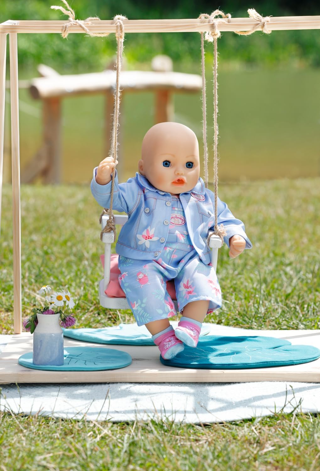 A four-piece jeans outfit for active explorers. 706268 ITEM-NO. 43 cm DOLL SIZE 3+ years AGE Baby Annabell is a little bundle of joy – she is always active and on the go. After all, there is still sooo much to discover in this world. And for that she needs an outfit that is not only cool and trendy but also comfortable and multifunctional. Jeans are really cool and allow her to move freely. The floral print on the jeans-look dungarees adds the necessary chic. The golden waterlily leaves on the white shirt are also a real eye-catcher. And when it gets a little colder, Annabell quickly puts on her jacket and cuddly socks. Original clothing for the Baby Annabell branded doll. The premium-quality accessories boost the imagination and offer new possibilities and stimuli for play. Baby Annabell Active Deluxe Jeans 43cm with jacket, shirt, trousers and socks.