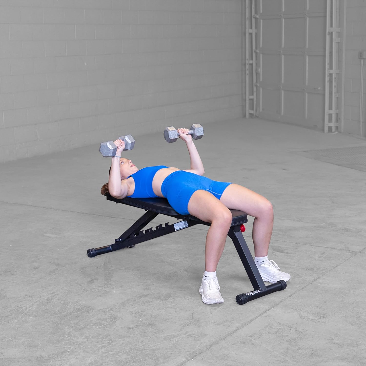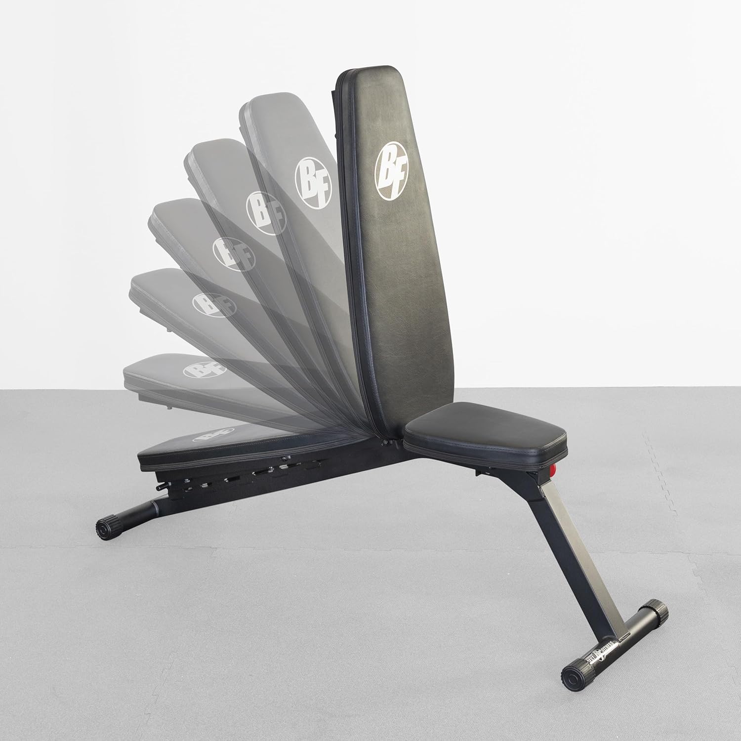 The Best Fitness BFFID25 Bench is a lightweight, versatile and portable weight bench ideally suited for home, garage, and basement gyms. This bench comes fully assembled and ready to use straight out of the box and features a solid 450 lb. weight capacity. Versatility is key with the BFFID25 Bench as it features a ladder-style fully-adjustable back pad with six precision-engineered angles. These angles are designed specifically to maximize effectiveness on a multitude of dumbbell and bodyweight exercises including chest press, incline press, dumbbell rows, shoulder press, and more.