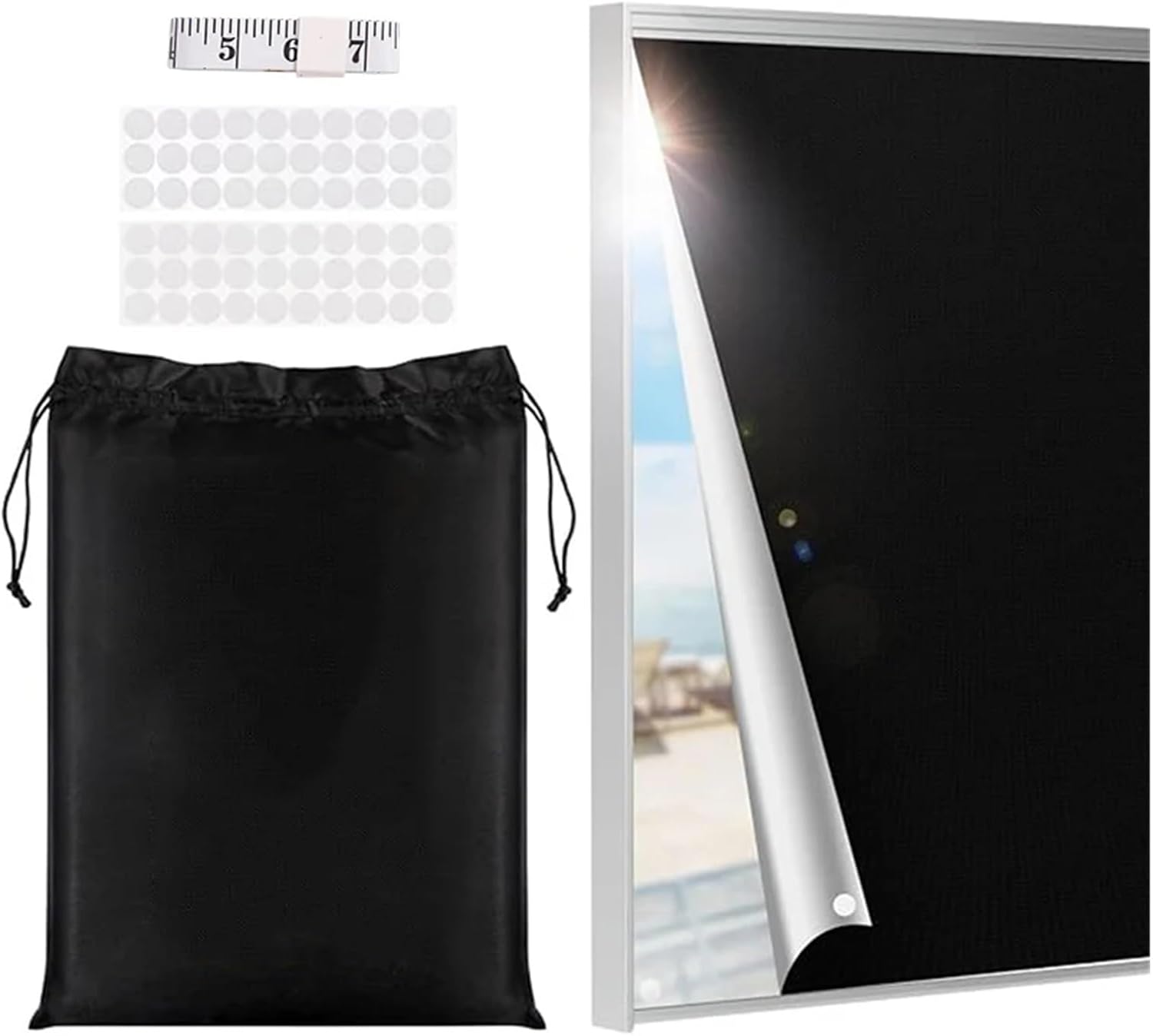 Color:BlackMaterial: Polyester fibreSize:S:145*100cm/57.1*39.4inM:145*200cm/57.1*78.4inL:145*300cm/57.1*118.1inPlease allow an error of 0.5-1 inches due to manual measurement.Package includes: Sunshade curtain * 1pc(Packaging bag*1pc+Self pasting*32pcs+Soft tape measure*1pc)