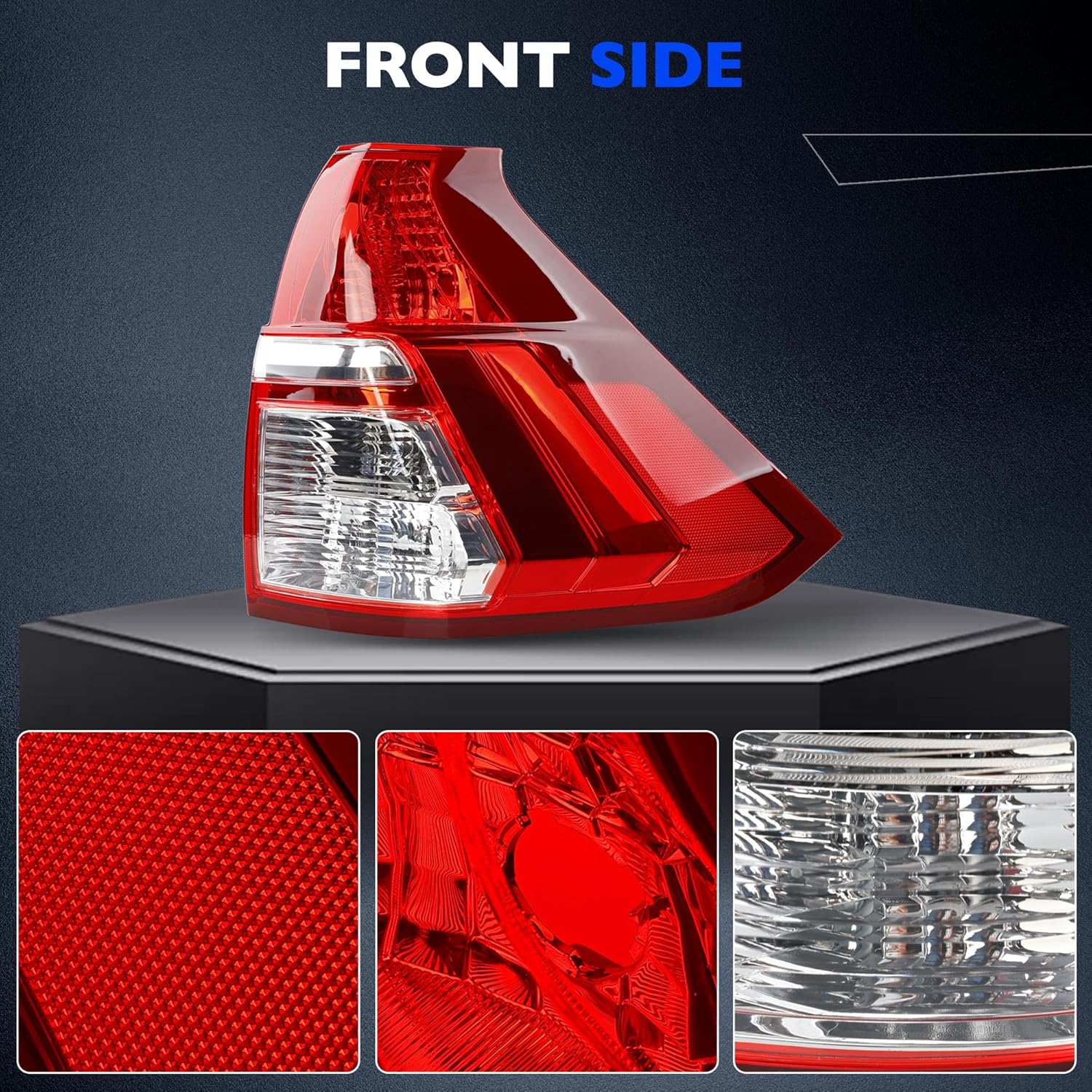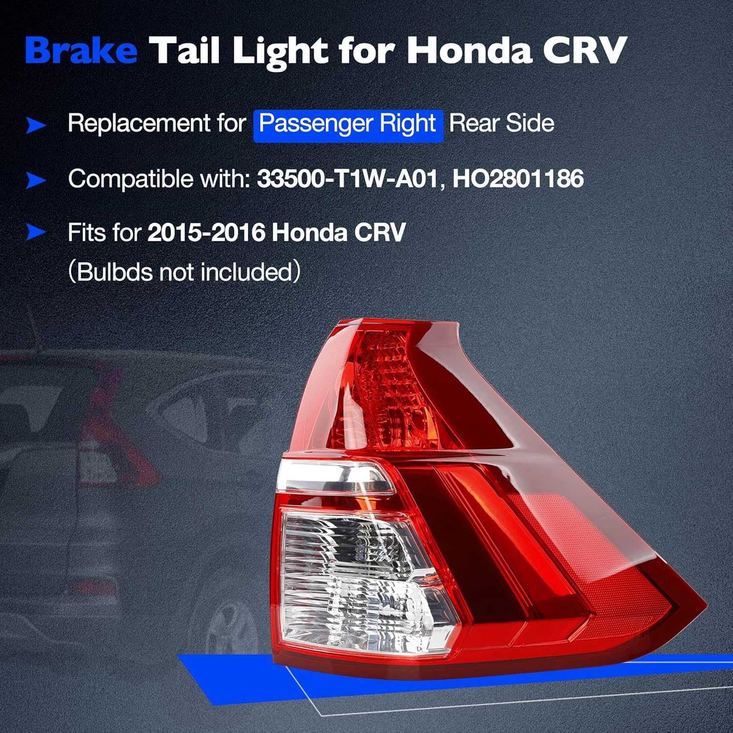 Package IncludesRight Passenger Side Tail Light Assembly(w/o bulbs and wire harness)OE Part Numbers33500-T1W-A01HO2801186Compatible With2015 - 2016 Honda CR-V EX 2.4L L4 GAS SUV 4-Door Automatic CVT AWD/FWD2015 - 2016 Honda CR-V EX-L 2.4L L4 GAS SUV 4-Door Automatic CVT AWD/FWD2015 - 2016 Honda CR-V LX 2.4L L4 GAS SUV 4-Door Automatic CVT AWD/FWD2016 - 2016 Honda CR-V SE 2.4L L4 GAS SUV 4-Door Automatic CVT AWD/FWD2015 - 2016 Honda CR-V Touring 2.4L L4 GAS SUV 4-Door Automatic CVT AWD/FWD