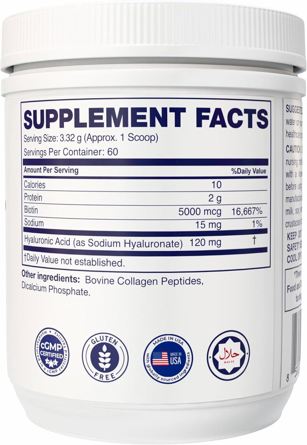 VITA MINE LAB Collagen + Biotin with Hyaluronic Acid is a high-quality dietary supplement powder designed to support healthy skin, hair, and nails. Each serving combines collagen peptides, biotin, and hyaluronic acid to contribute to the maintenance of healthy skin, hair, and nails. Formulated Gluten-Free and Halal Certified, this unflavored powder is easy to mix into drinks or smoothies and suitable for daily use. Manufactured in a GMP-certified facility in the USA, each serving is made to ensure purity and quality. With 60 servings per container, this supplement provides a convenient daily supply to support your wellness routine.