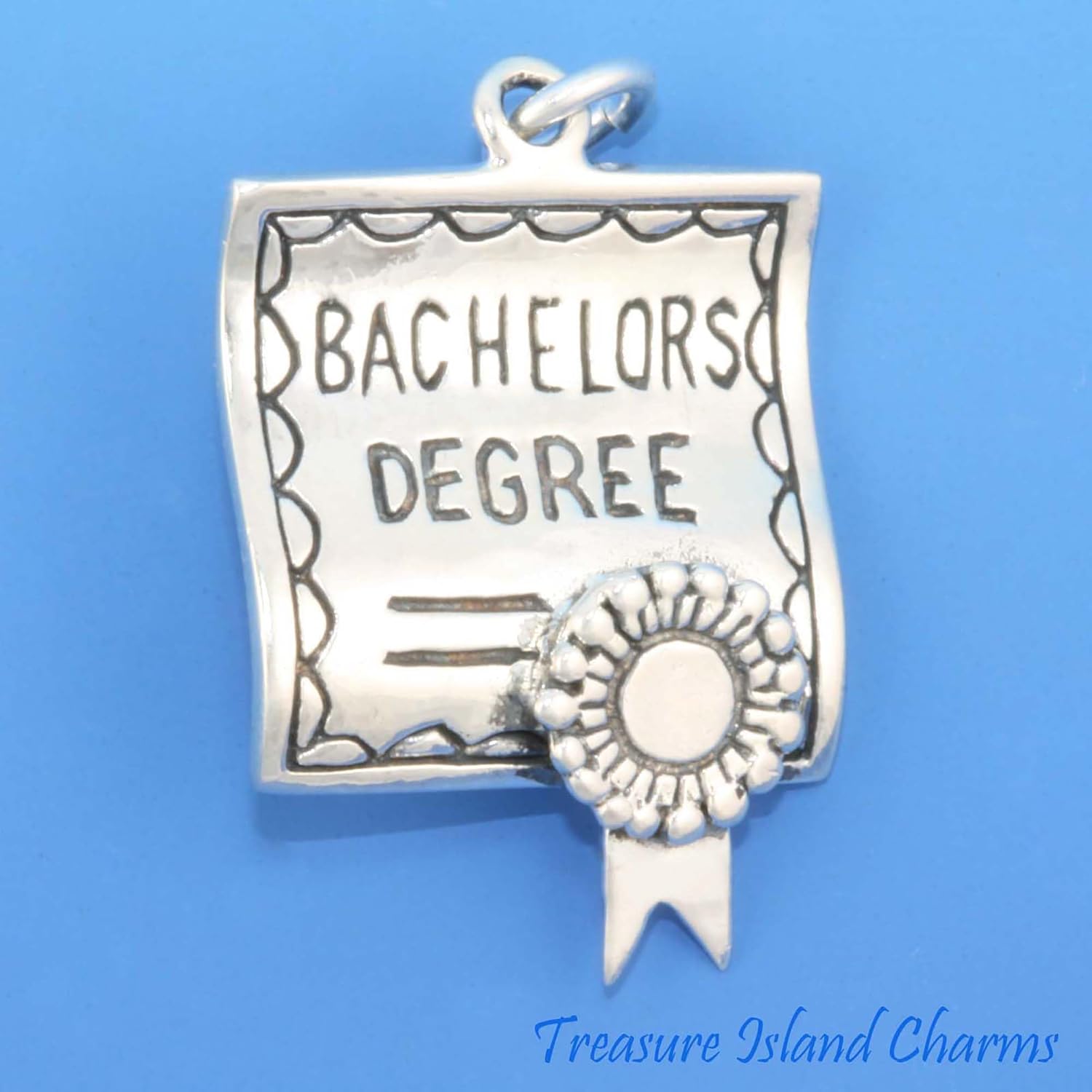Bachelor's degree graduation diploma 3D 925 solid sterling silver charm with a 6mm sterling silver split ring attached to it. The charm is ready to fit your traditional charm bracelet.