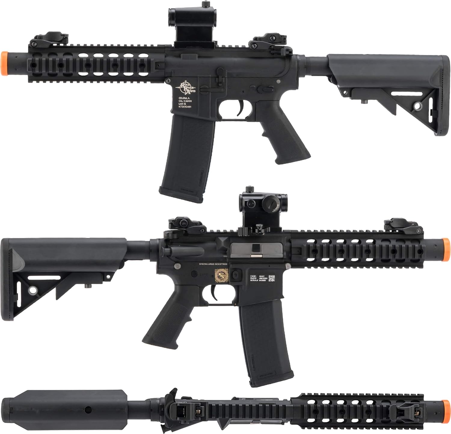 Ultra lightweight fiberglass reinforced polymer receiver Licensed Rock River Arms logos Nylon fiber furniture Metal barrel assembly, flash hider, charging handle, and sling swivels ESA quick spring change system allows the spring to be changed without the need to disassemble your gun Rotary type hopup with 6.03mm tight bore barrel 380 fps spring pre-installed from factory, optional 310 fps (M90) spring included to reduce muzzle velocity Freefloat quad rail handguard w/ suppressor Specna Arms meets the expectations of clients by presenting the CORE line of products - an exceptional series of replicas that introduces a new quality to the market. An attractive price in combination with an innovative spring change system as well as high-quality materials make this replica suitable for beginners and seasoned airsoft players alike. The receiver, stock slide, handguard and a SF stock that holds the battery, as well as the pistol grip, were made from nylon reinforced polymer. Remaining components such as the barrel, flash hider, enlarged charging handle and tactical sling swivels were made of metal (parts made of steel include the screws, pins, shell ejection window and mock bolt carrier). The receiver bears markings and a serial number. The replica's parts fit very well together and the User will not experience any loose spots between the lower and upper receiver. The use of a light polymer receiver allowed for a reduced weight, which makes it very suitable for dynamic games or long-lasting mil-sims. What's more, fiberglass reinforcement makes the receiver also more durable than polymer and metal receivers.