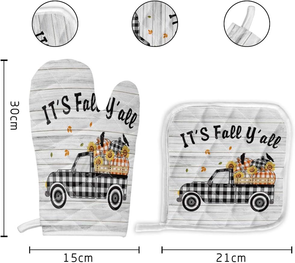 Fall Kitchen Oven Mitts and Pot Holders, IT'S FALL Y'All Thanksgiving Truck and Pumpkins Wood Plank Texture Kitchen Oven Gloves Hot Pads Set for Kitchen