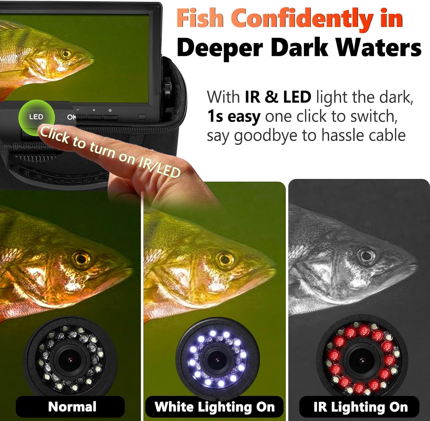| BuiltIn Media | FishPRO HD 1200TVL Underwater Fishing Camera with 12pcs Infrared and 12pcs White LED lights built in 32GB Memory Card x1 |