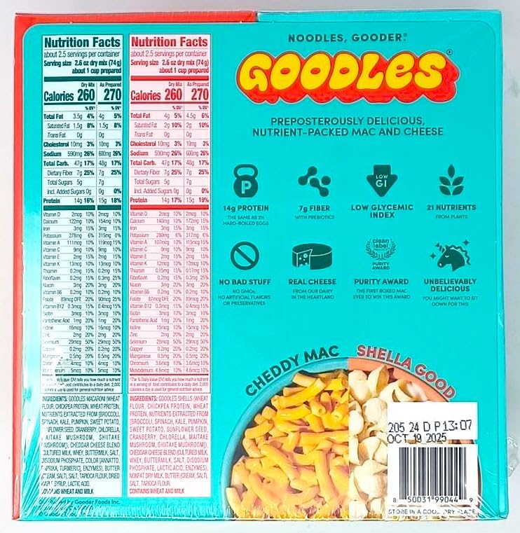 Goodles Mac & Cheese Variety Pack. 8 x 6 oz boxes. 4 Cheddy Mac & 4 Shella Good. 14g Protein, 6g Fiber with Prebiotics, 21 Plant-Based Nutrients and Made with Real Cheese. 4 Cheddy Mac - Creamy cheddar and macaroni. 4 Shella Good - Aged white cheddar and shells. 14g protein, 7g fiber, low glycemic index, 21 nutrients, no bad stuff, real cheese, purity award, unbelievably delicious. Made in USA.