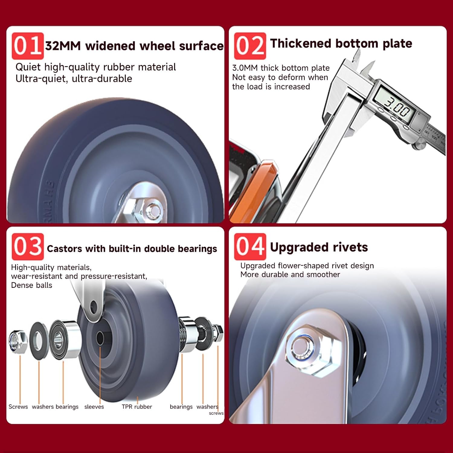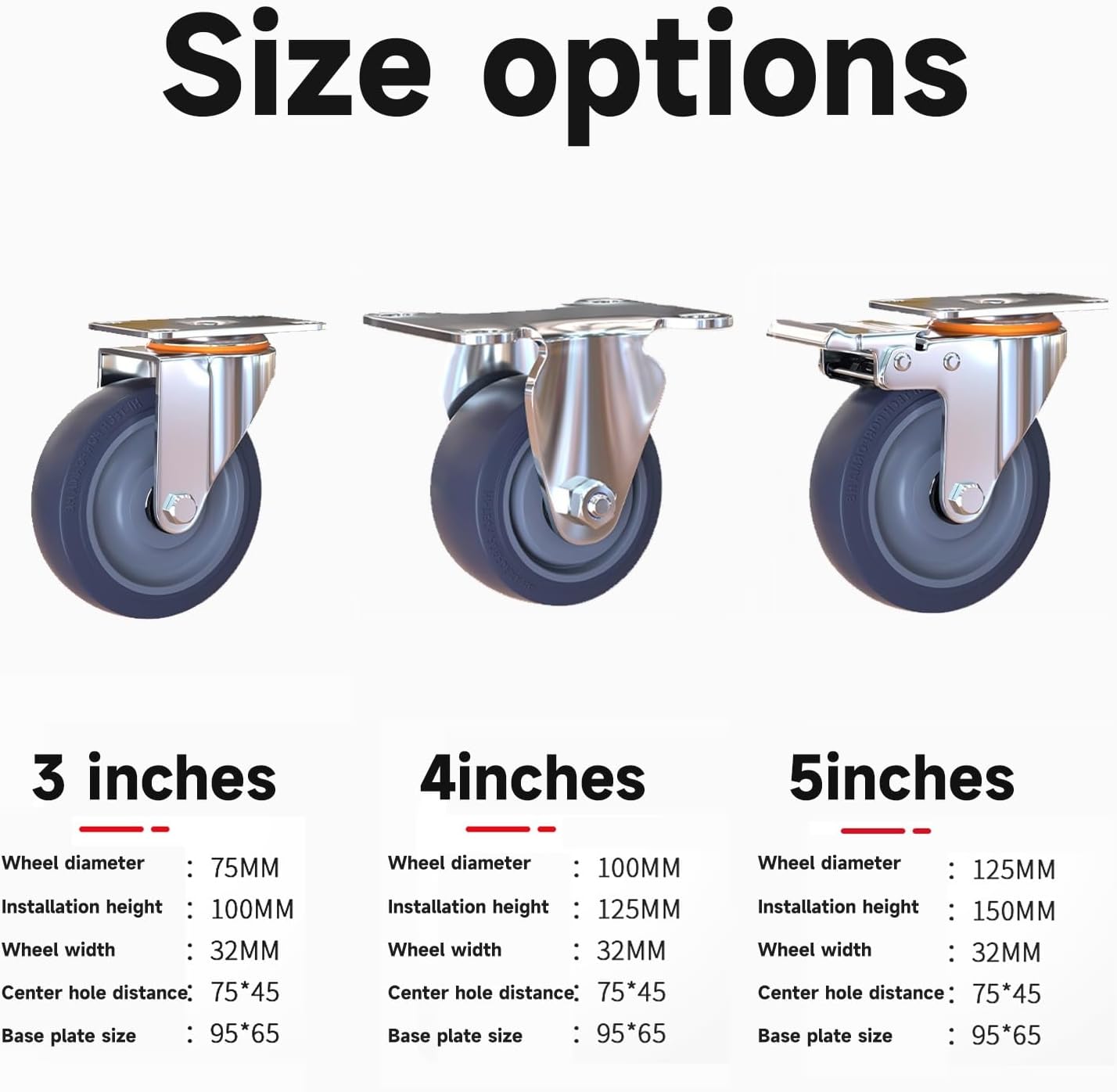 Welcome to my shop!We regard every customer as our precious friend and always provide the best service!Our casters have 360 degree maneuverability These rubber casters are equipped with a 360 degree swivel bracket, and the wheels can turn in any direction. Smooth, quiet and sturdy.Flexible: It is easier and more flexible to move light furniture, tables, cabinets and equipment to the destination. The caster size is suitable for small projects, it will not leave marks or scratches on hardwood floors, and the furniture can roll easily with the swivel wheel set. Smooth and non-marking, the heavy-duty casters are made of high-quality polyurethane, wear-resistant and shock-absorbing, equipped with silent shock absorbers, and glide smoothly. Perfect for transporting light furniture and display items quietly and safely.Suitable for all floors: The casters are designed for small spaces and light furniture, such as easels, crates, shelves, racks, plant stands, rolling platforms, carts and DIY projects.Product Name: Heavy Duty Furniture CasterCaster Material: Rubber.Ball Bearing: Double Ball Bearing.Size: 3/4/5 inchesCountry of Origin : ChinaQuantity: 4 piecesWarm Tips: Due to manual measurement, there may be an error of 1-2 mm, please understand. If you have any questions, please contact us by email, we will provide you with a satisfactory answer in time.