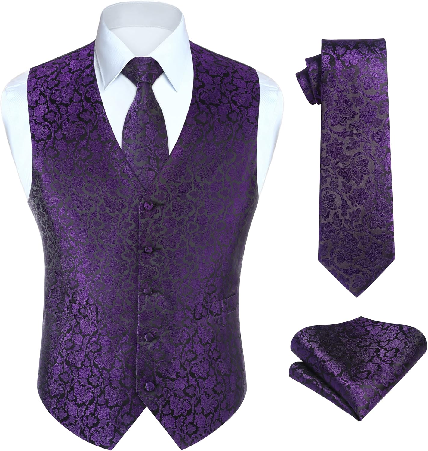 Men's Wedding Tuxedo Vest Set. Great for Weddings, Prom and other formal occasions. Exceptional Quality. This is our size chart for your reference: SIZE XS - Chest 39", Waist 38", Shoulder 3.6", Front Length 25.1", Back Length 22.8", SIZE S - Chest 40", Waist 39", Shoulder 3.8", Front Length 25.5", Back Length 23.2", SIZE M - Chest 42", Waist 41", Shoulder 3.8", Front Length 25.9", Back Length 23.6", SIZE L - Chest 45", Waist 44", Shoulder 4", Front Length 26.3", Back Length 24", SIZE XL - Chest 48", Waist 47", Shoulder 4.2", Front Length 26.7", Back Length 24.4", SIZE 2XL - Chest 51", Waist 50", Shoulder 4.4", Front Length 27.1", Back Length 24.8", SIZE 3XL - Chest 54", Waist 53", Shoulder 4.6", Front Length 27.9", Back Length 25.5", SIZE 4XL - Chest 57", Waist 56", Shoulder 4.8", Front Length 28.7", Back Length 26.3", SIZE 5XL - Chest 60", Waist 59", Shoulder 5.2", Front Length 31.1", Back Length 28.7", SIZE 6XL - Chest 64", Waist 63", Shoulder 5.2", Front Length 31.1", Back Length 28.7".