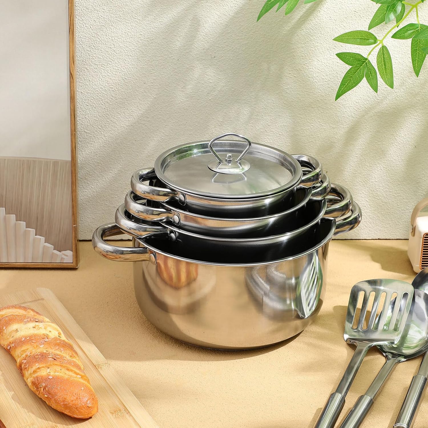 Package List 4 x Soup pots (4 sizes) 1 x frying pan 1 x milk pot 1 x Wok Slotted Spatula 1 x Soup Ladle 1 x Spoon Characteristics -Product Info: Stainless steel cookware set - Size: 17.50X17.50X8.50cm/6.88X6.88X3.34in -Kitchen pot set: with a range of pots in various sizes, this kitchen pot set covers all your cooking needs, making it a versatile addition to your kitchen - Size: 25.00X25.00X12.50cm/9.82X9.82X4.91in -Color:Silver - Size: 19.00X19.00X10.50cm/7.47X7.47X4.13in - Size: 35.00X17.30X8.50cm/13.76X6.80X3.34in -Strong construction: this cookware set is made from stainless steel, resistance to wear and tear, ideal for everyday cooking stainless steel kitchen utensils -Material:Stainless steel - Size: 21.00X21.00X11.00cm/8.25X8.25X4.32in - Size: 43.00X25.00X6.50cm/16.90X9.82X2.55in -Complete utensil set: includes essential cooking utensils, enhancing your cooking experience and ensuring you have the necessary tools for efficient meal preparation -Stovetop versatility: compatible with all stovetop types, including gas, induction, electric, and ceramic, this cookware set offers the flexibility to cook onto any surface with easeGoods Informationinduction stainless steel cookware Enhance your culinary skills with this stainless steel cookware set.stainless cookware The polished finish not only looks stunning but also resists stains, ensuring your cookware remains pristine for years to come.steel pans for cooking Ideal for a variety of cooking methods, from induction to gas stoves, it offers versatility and convenience