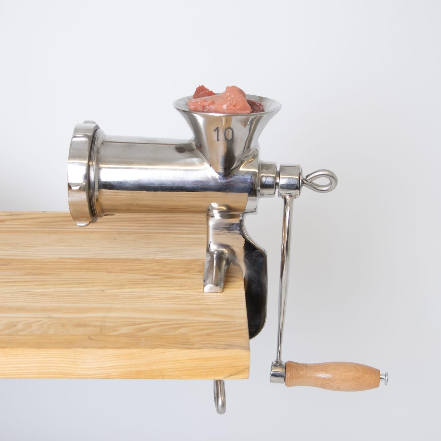 Stainless Steel Meat Grinder with Clamp The secret to the best burgers? Grind your own meat! Our hand-cranked Clamp-On #10 Meat Grinder gives you full control of your food, from the freshness and quality to the flavor. And it's made of 304 stainless steel, so it's super durable. Features Built-In Clamp - Secure the grinder to a stable surface up to 1.65" thick. When you're done, you can easily remove the grinder and stow away.. No Electricity Needed - Use the grinder in off-grid cabins or your everyday home. Hand-crank design with ergonomic beech wood handle for a comfortable grip.. Ideal for Medium Grinds - Grinds about 0.5 to 1 pound of meat per minute. Includes one stainless steel grinding plate - 3/16" holes (4.7 mm).. Grind a Variety of Meat - Beef, pork, chicken, venison, fish, even some low-moisture veggies like onions, peppers, or mushrooms for added flavor. You can also use this grinder to make sausage (stuffing horns not included).. 304 Stainless Steel Construction - Built for durability. Easy to assemble and disassemble for cleaning, too.. Overall: 9"L x 4.31"W x 11.5"H. Grinding Plate: 3/16" holes (4.7 mm). Weight: 8.2 lbs. Origin: China.