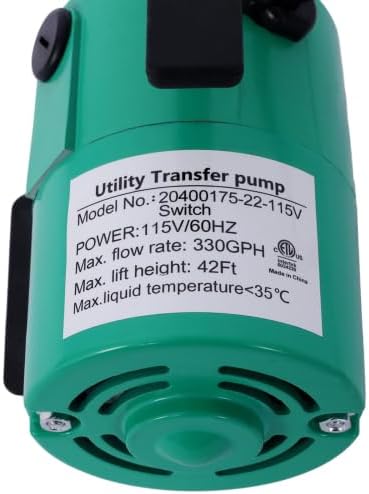 Product Features: DURABLE DESIGN: Constructed with high-quality materials, this utility pump is built to last and can withstand regular use in various environments. QUIET OPERATION: The advanced motor technology ensures that the pump operates quietly, making it suitable for use in residential and commercial settings. VERSATILE APPLICATION: From draining hot tubs to clearing flooded areas, this pump is versatile and can handle a wide range of water transfer tasks with ease. ENERGY-EFFICIENT: The efficient motor design enables the pump to transfer water quickly and effectively while minimizing energy consumption, saving you money on electricity bills. illustrated description: Self-priming, portable with convenient carry handle. Slip-resistant rubber bumpers keep pump in place during use. Ideal for any water transfer application. Housing Material: Powder-coated carbon steel Power supply: 115V / 60Hz 170w Max Pump rate: 330GPH Max.height: 40 feet Max.depth: 3mm Max.suction lift: 3ft Outer dia.: 3/4" Grain size: 1mm Water Temperature Range: (32 to 113°F) UL-approved PVC Cable: 6 feet With 6ft water hose