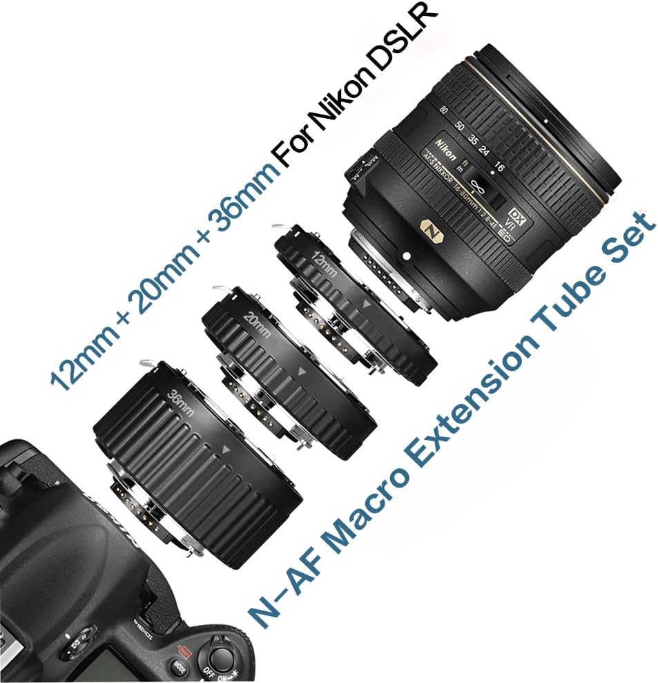 Product Description Description : 1.【Exposure compensation】Use all shooting modes of the camera, exposure compensation is required. Magnifying your targets by closer distance, make it bigger in your picture. And recommend use the manual mode to change the shutter speed directly to control the exposure level. 2.The imagic magnification ratio becomes smaller as the focal length of master lens becomes longer and the larger as the focal length becomes shorter . 3.The distance to the subject becomes further away as the focal length of master lens becomes longer and closer when it becomes shorter. 4.In close-up shooting,as the subject's depth of field becomes shallow,never forget to stop down the lens. Features: 1.for All Nikon SLR cameras and SLR lenses. 2.The Auto Focus Macro Extension Tube Set can Transform your Lens into a Macro Lens, easy to Take Subtle Pictures 3. It moves the Lens from the Film or Digital Sensor, the Closer the Focus is, the Greater the Magnification 4. Macro extension tube can be used alone or in superimposed,(12mm or 20mm or 36mm ) or combination (12mm+20+36mm=68mm) Compatible Camera: for Nikon D7200 D7100 D7000 D5600 D5500 D5300 D5200 D5100 D5000 D3500 D3400 D3300 D3200 D3100 D3000 D810 D800 D750 D700 D610 D600 D300 D200 D90 D80 D70 D60 D3X D4 D4S DF Camera Specifications: Material: Metal+Plastics Tube Diameter: 12mm, 20mm, 36mm Package Includes: 1x Extension Tube Ring Set