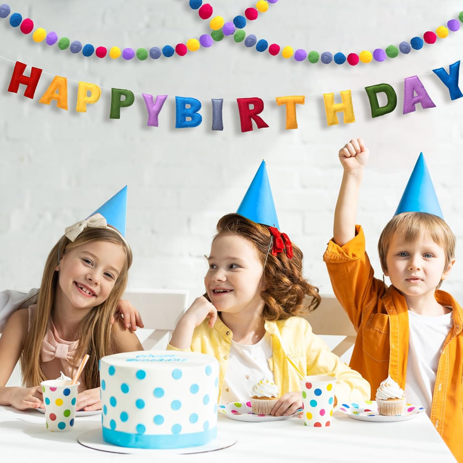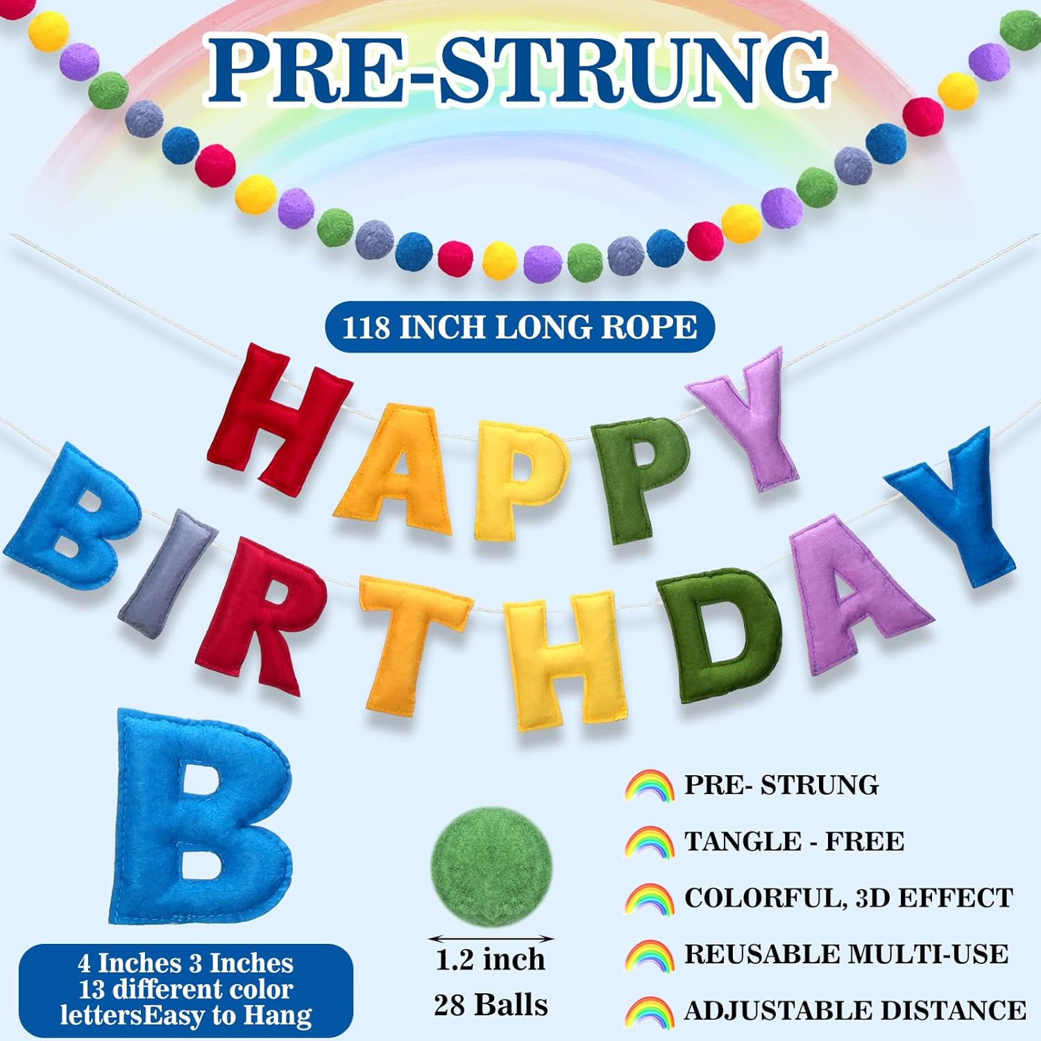 Features: Our rainbow colored felt letters balls banner is not only eye catching but also easy to hang. With pre strung design, you can set it up in a jiffy. It is designed to create minimal fuss, allowing you to spend more quality time with your loved ones during your special moments. Thes rainbow felt ball birthday garland offers a splendid way to refresh your party space and add an element of vivacity. The vibrant rainbow colored balls and quality felt materials give a fresh, lively vibe to your celebration area. Let our banners make your special day even more joyous and memorable. Specifications: Material: felt Color: rainbow color Size: Happy birthday banner: about 118 inches/ 3 meter in length Ball garland: about 118 inches/ 3 meter in length Ball: about 1.2 inches/ 3 cm in diameter Letter: about 4 inches high Package includes: 1 x Happy birthday felt banner 1 x Felt ball birthday garland Notes: Manual measurement, please allow slight errors on size. The color may exist a slight difference due to different screen displays.