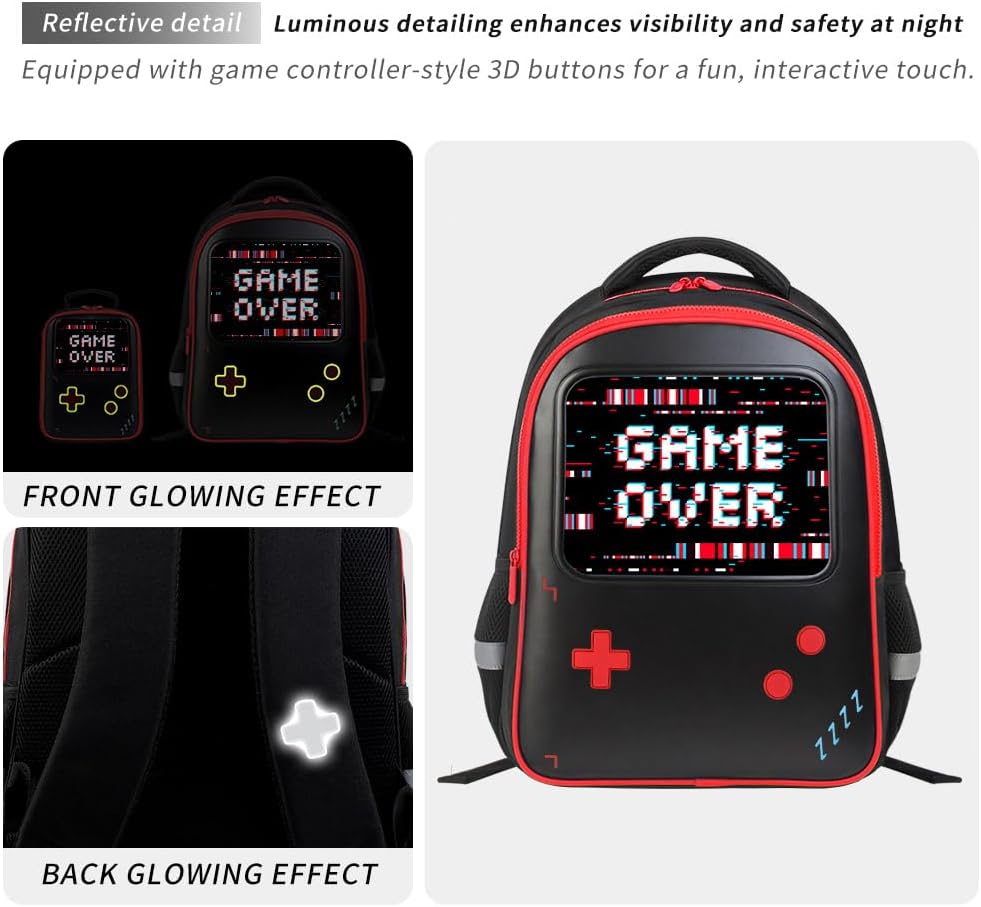 • 【3-IN-1 BOYS BACKPACK SET】A perfect matching set for your boys back-to-school essentials.This set includes a boys backpack with a matching lunch box,and a pencil case,making it a complete package for school.Sizes: Boys backpack: 17.3"x7.1"x11.4" (HxWxL).Lunch bag: 10.2"x7.5"x3.5".Pencil case: 9.5"x4.3"x2.2".The game-inspired design is vibrant and captivating,guaranteed to be a hit with the kids!