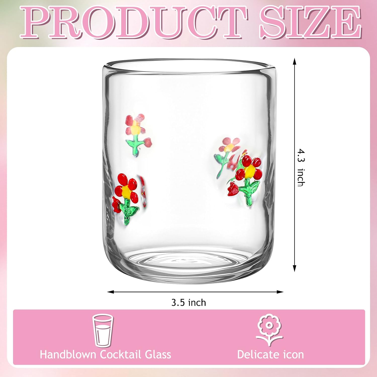 Features: Seasonal Appeal: These icon juice glasses create a cheerful ambiance that enhances the holiday charm, making every sip feel special during summer. Icon Style Design Element: Featuring eye catching Spring theme graphics, these glasses stand out as a decorative piece on any table. Specifications: Material: glass Color: pink, green, white Size: 3.5 inches x 4.3 inches (W x H) Capacity: 14 oz Package includes: 2 x Flower icon juice glasses Notes: Manual measurement, please allow slight errors on size. The color may exist a slight difference due to different screen displays