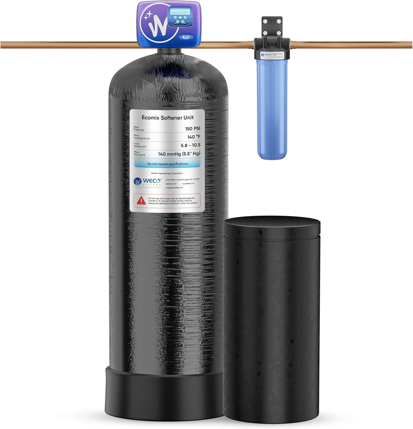 ECOMIX Softener/Filter is used for treatment of problematic well water that has iron, manganese, hardness, tannins. May also be used with chlorinated city water with max 1 ppm chlorine or with pre-treatment with carbon. Please contact WECO Filters with your water analysis for size and pre/post-treatment recommendations. See operating limits/specifications of the treatment system for backwash & service flow rates. ECOMIX is an advanced softening material for the reduction of hardness, iron, manganese and tannins from potable water. The media is regenerated in the same manner as a standard water softener with sodium chloride available as standard salt pellets at any local hardware store. ECOMIX has the ability to reduce ferrous and organic iron by adsorption and oxidation on the surface of the media. System comes standard with a SXT backwash control valve internally sized to your specific model flow requirements and a big blue sediment pre-filter that removes sand, grit, precipitated mineral particles, insoluble iron oxide and other debris down to 5 microns. Can be used for both residential and commercial / industrial applications. We recommend installation by a licensed plumber to insure adherence to all local codes.